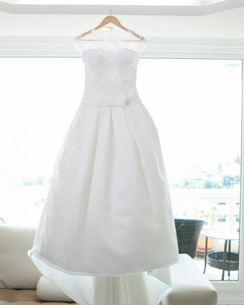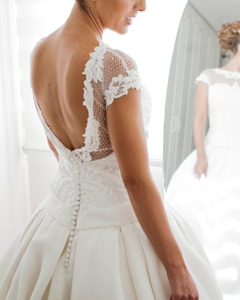 Diseño clásico y atemporal que combina romanticismo y elegancia. El modelo Orga de Aire Barcelona destaca por su cuerpo de encaje bordado con delicadas transparencias en tul ilusión, que crean un escote joya sutil y femenino.