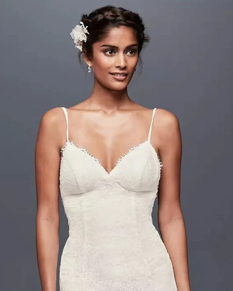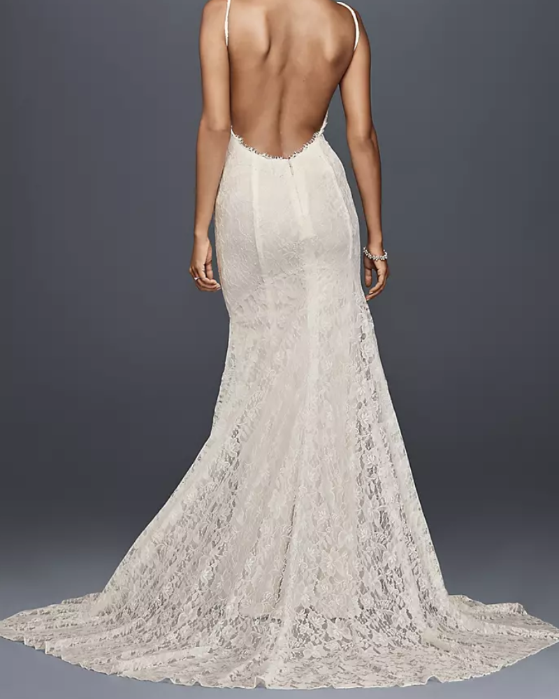 Este vestido de encaje ligero es ideal para novias que buscan comodidad sin renunciar al romanticismo. Su silueta ajustada realza la figura con delicadeza, mientras el escote corazón y los tirantes delgados aportan un toque sutil y femenino. La espalda descubierta añade un aire sensual y moderno, y su cauda suave cae con gracia sin resultar pesada. Perfecto para bodas en clima cálido o para moverte con libertad en tu gran día.