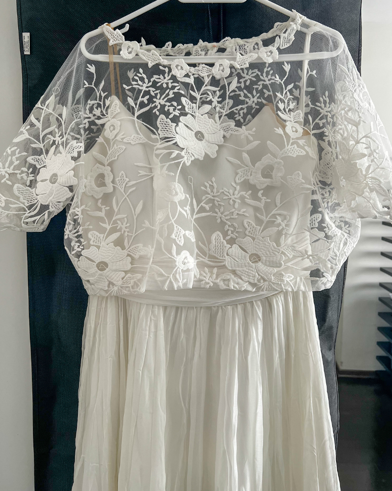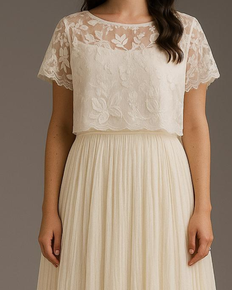 Vestido de novia en tono blanco perla, con falda fluida de gasa plisada y un delicado top de encaje floral con mangas cortas. Su silueta ligera y romántica lo convierte en una opción ideal para bodas íntimas o al aire libre, con un aire bohemio y elegante.