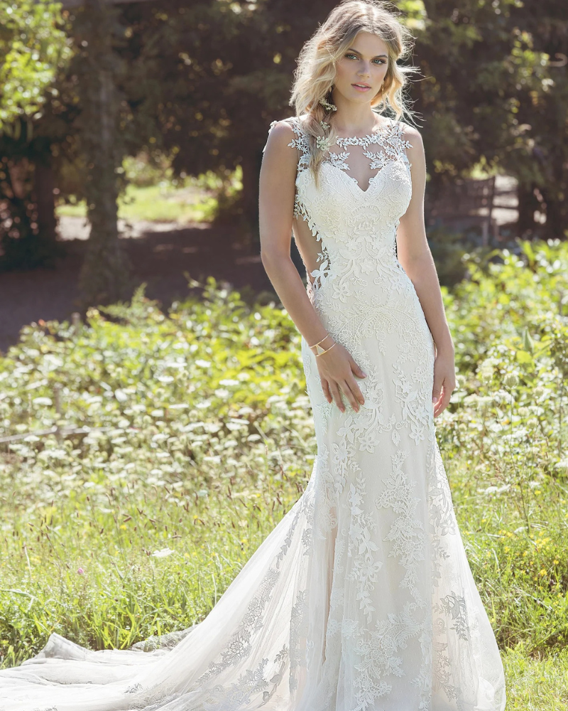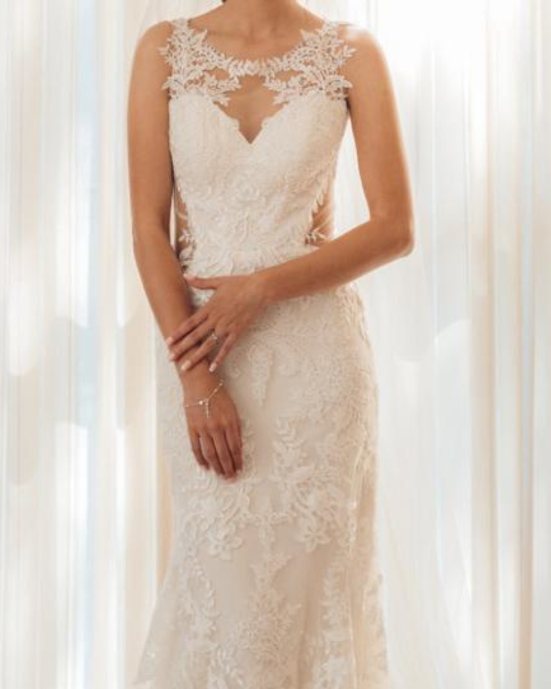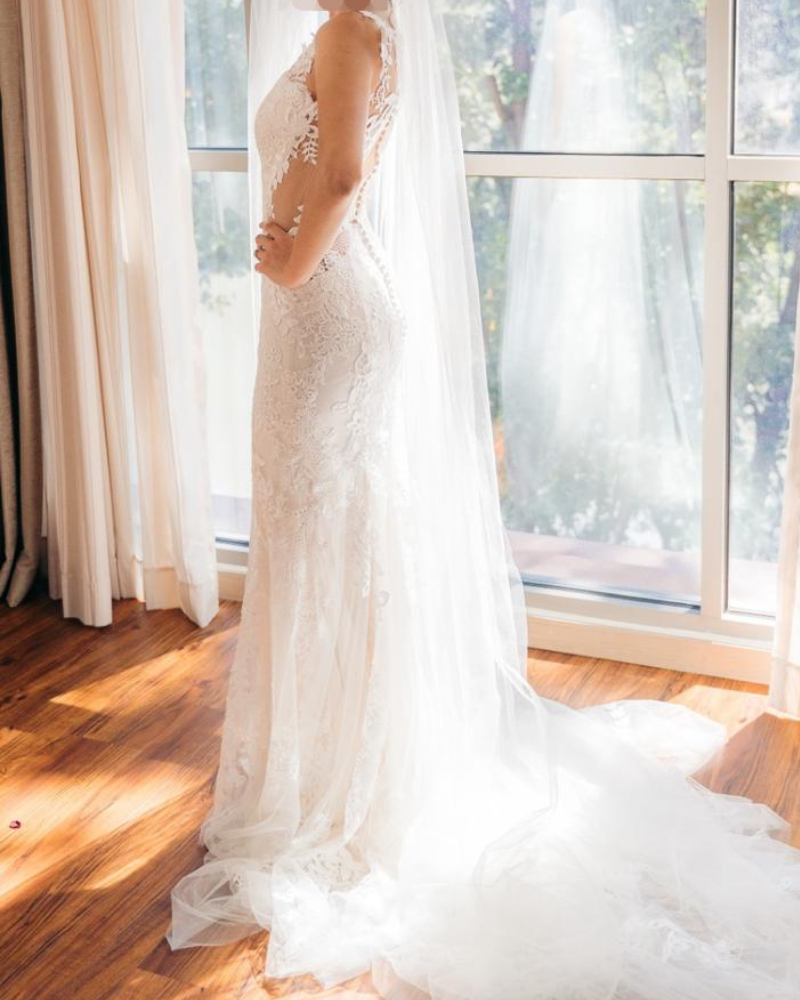 Este vestido de novia de EDDYK es una opción elegante y sofisticada para una novia que busca un look romántico y moderno. Su diseño ajustado tipo sirena realza la silueta con una caída fluida y delicada. Tiene un escote en V profundo con aplicaciones de encaje floral bordado, aportando un toque femenino y sensual. Espalda baja y transparente con detalles de encaje, creando un efecto sofisticado y elegante. Una Falda lisa y fluida que se desliza suavemente, destacando la figura sin perder comodidad. Y un hermoso tren de encaje con detalles florales, aportando un acabado espectacular y digno de un cuento de hadas.