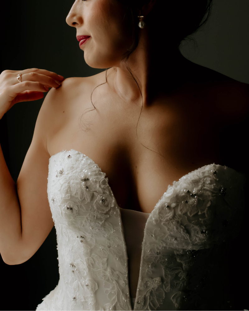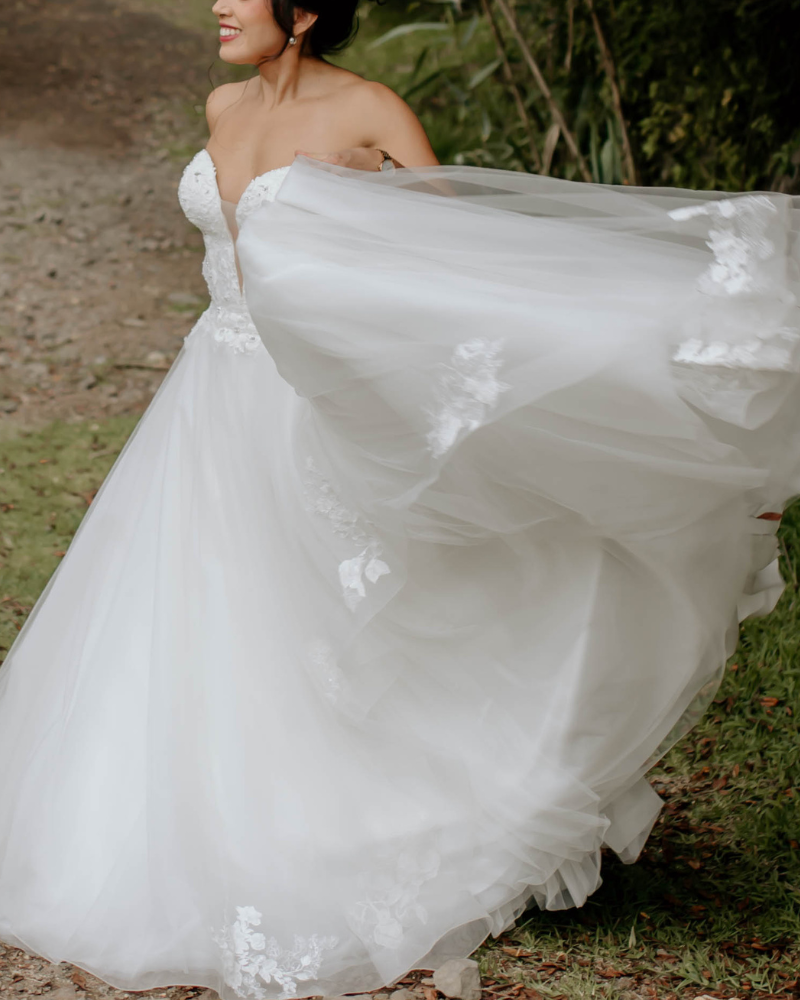 Combina elegancia y delicadeza. Presenta un tul ilusión con intrincados bordados florales en relieve, un corpiño entallado con detalles brillantes que realzan la figura, y una falda de tul que fluye con ligereza. Lo que le da un toque más fresco y estilizado, ideal para bodas para quienes buscan un diseño minimalista. El escote es sutil, complementando el delicado bordado de flores que adorna el diseño. Es una opción perfecta para novias que desean un look romántico pero contemporáneo.