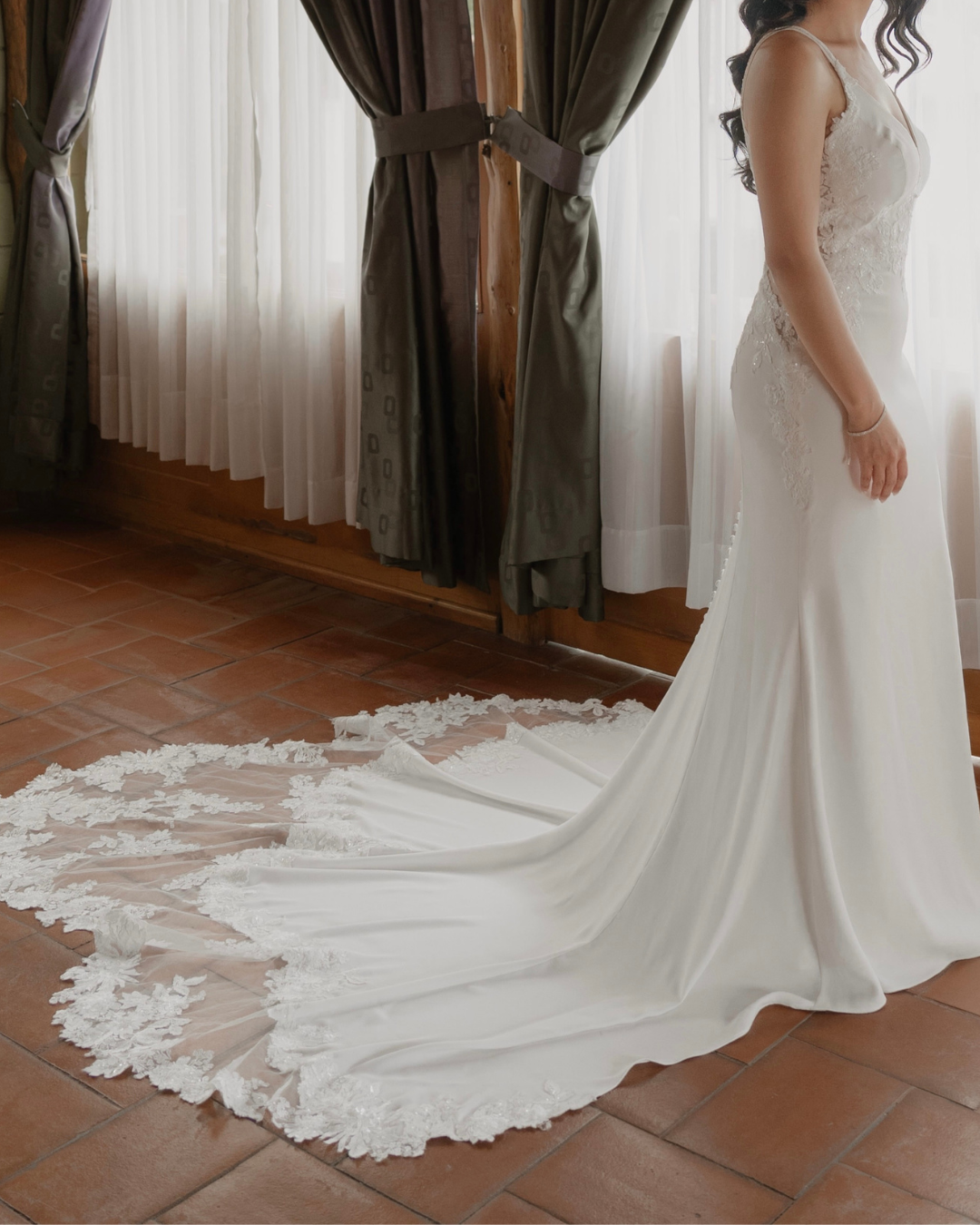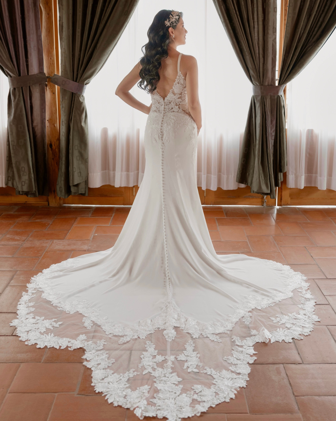 El vestido Aire Barcelona Provenza destaca por su elegante silueta sirena en crepé, que realza la figura con naturalidad. Su espalda con encaje y botonadura aporta un toque romántico y sofisticado. La cola, de tul con delicados bordados florales, añade ligereza y un acabado espectacular.