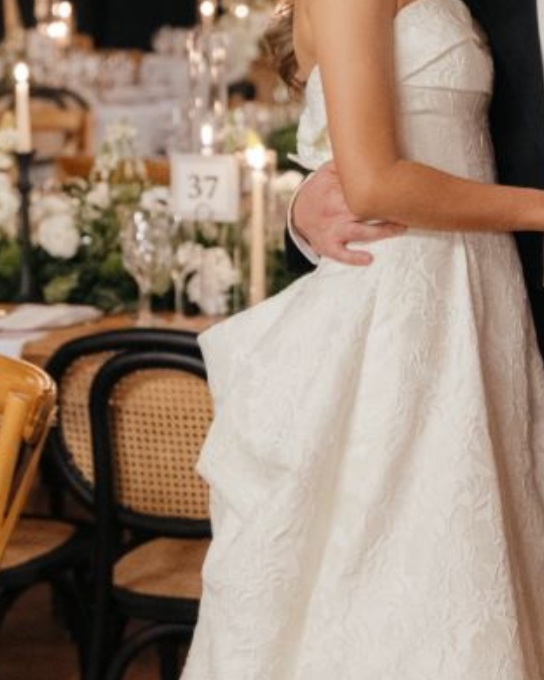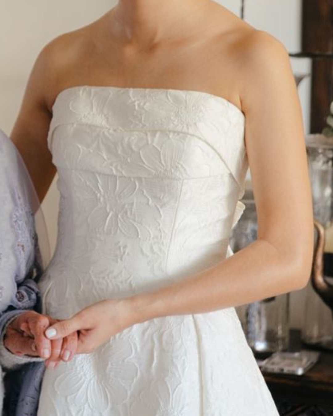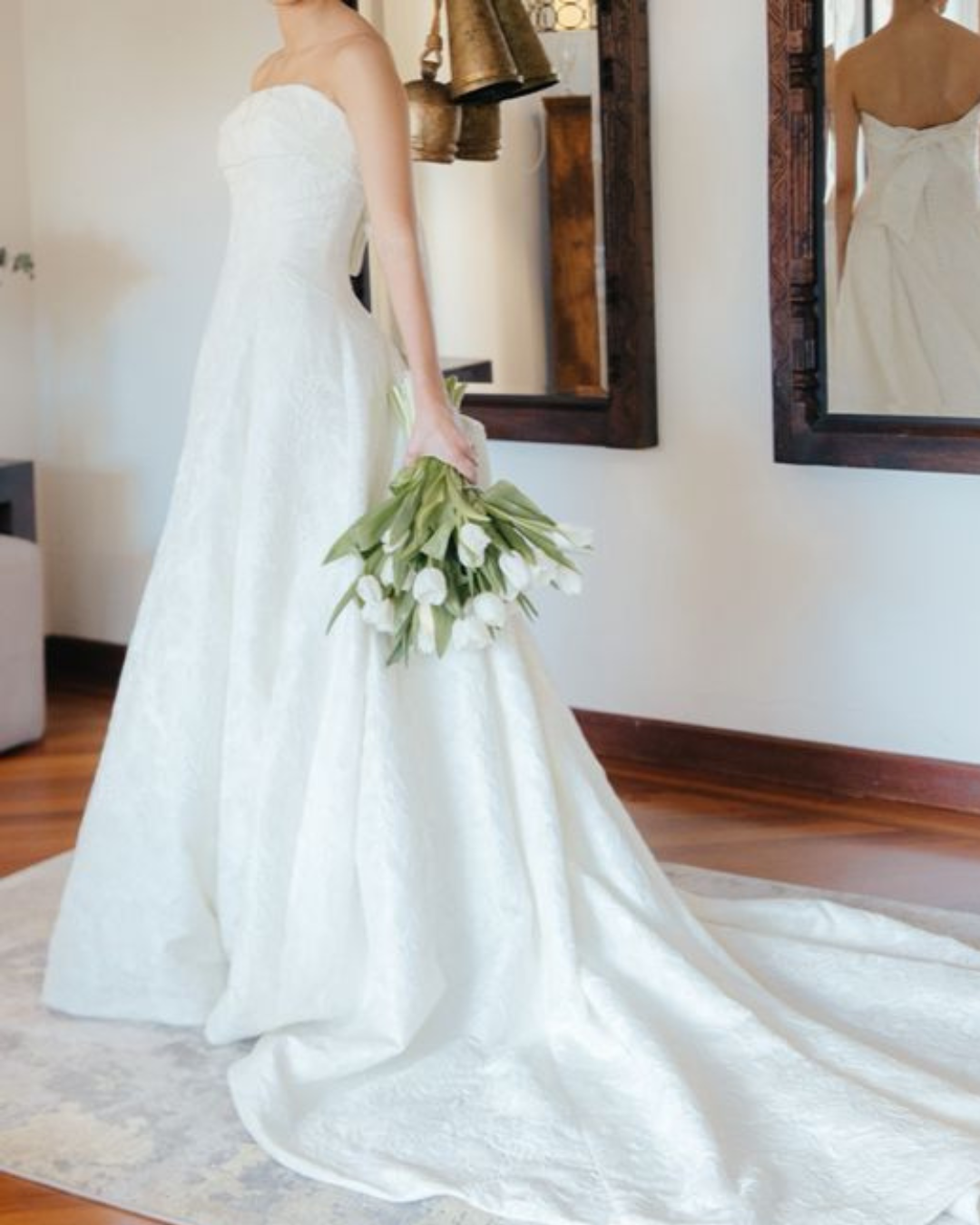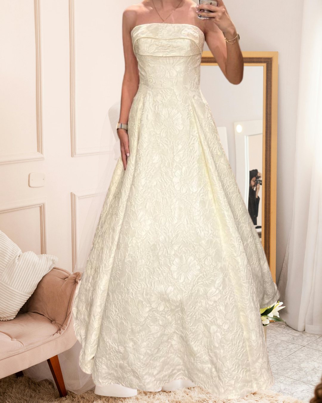 Vestido de novia palabra de honor de líneas limpias y elegancia atemporal, diseñado por Alberto Palatchi. Confeccionado en un exquisito tejido de jacquard con brocado floral, este diseño destaca por su textura sutilmente en relieve, que aporta profundidad y sofisticación sin renunciar a la sobriedad.