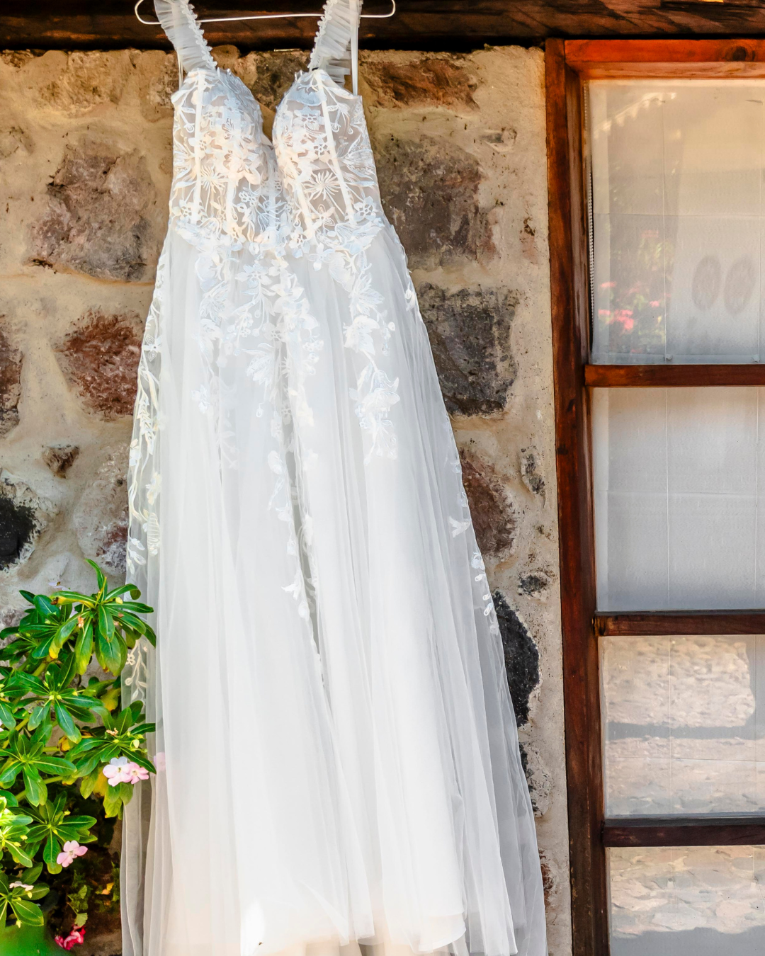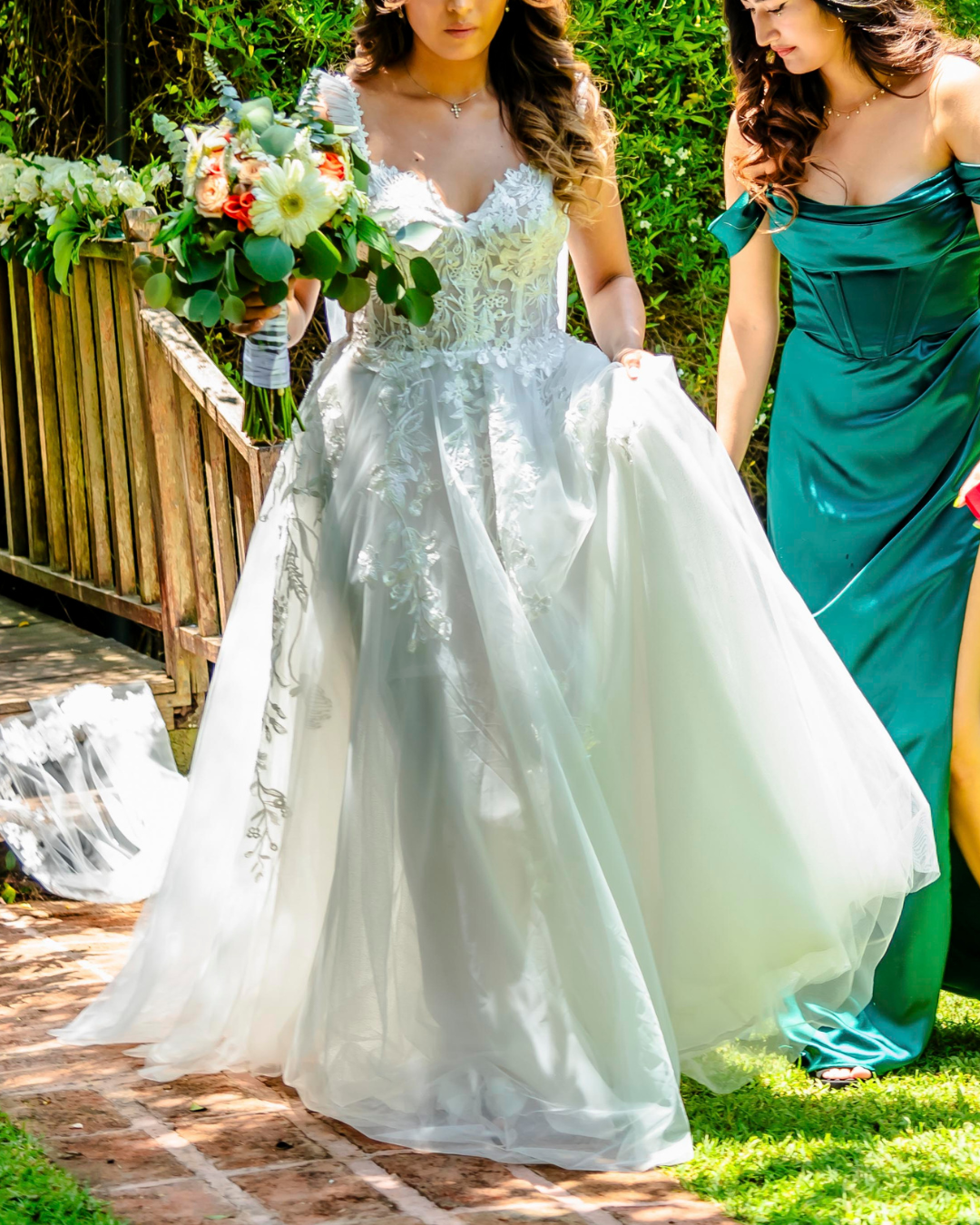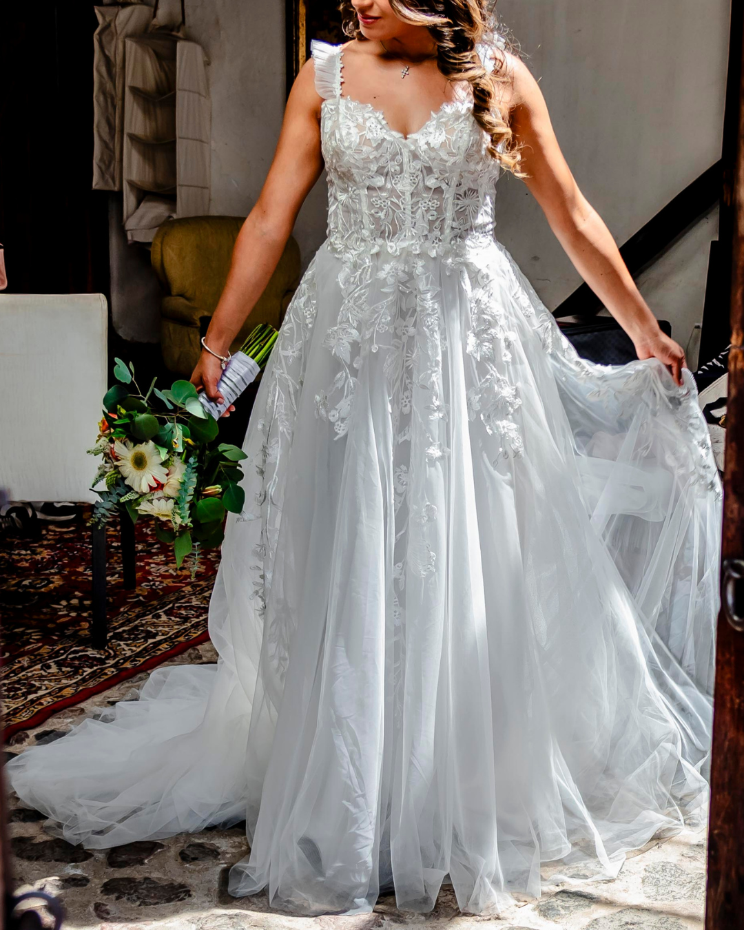 Vestido de novia de estilo romántico con falda amplia de tul que aporta movimiento y ligereza. Su corset estructurado con delicadas aplicaciones de encaje floral realza la silueta, mientras los tirantes finos y el escote suave aportan un toque femenino y elegante. Un diseño perfecto para novias que buscan un look natural, sofisticado y lleno de encanto para su gran día.