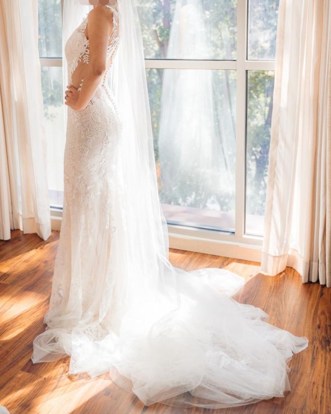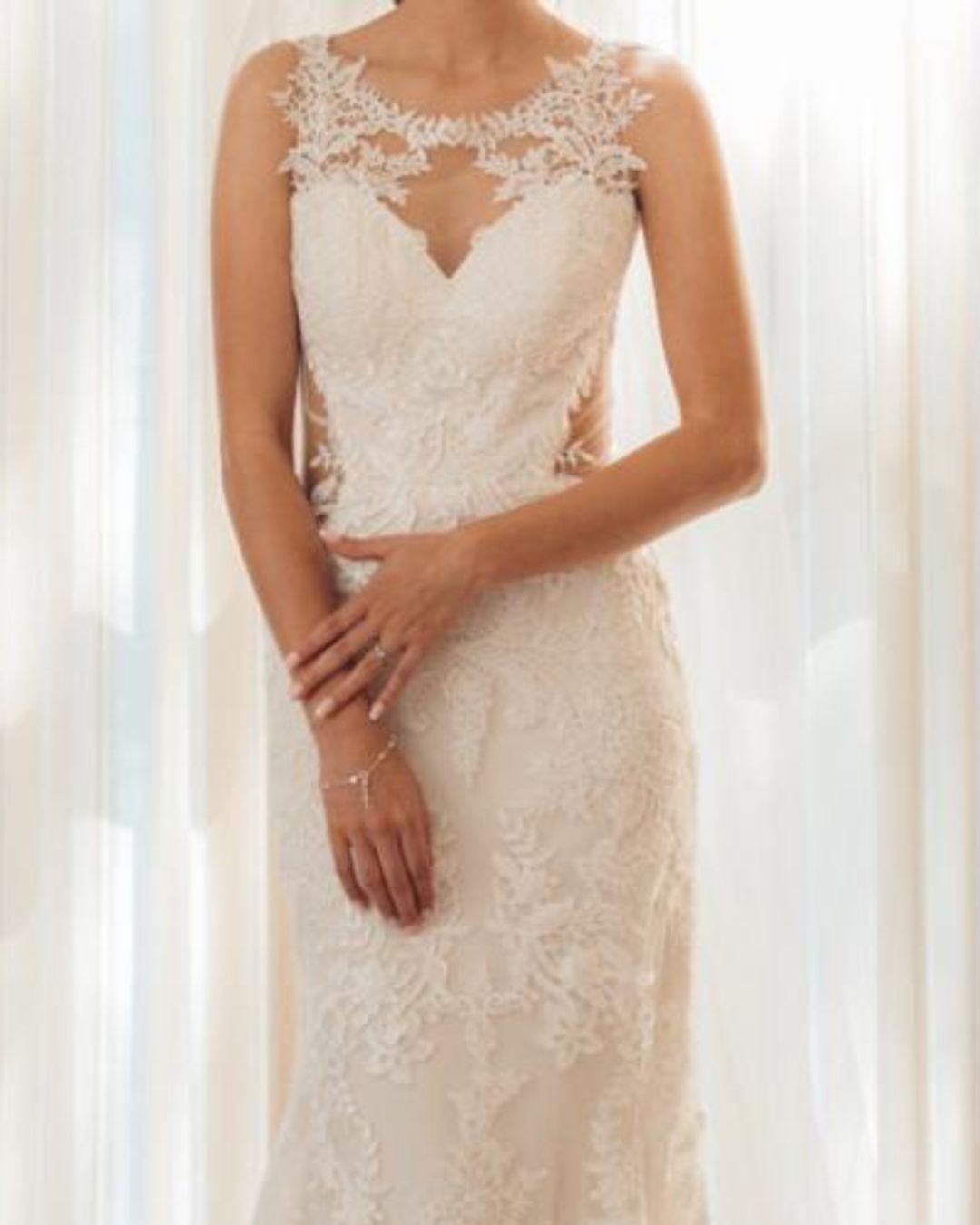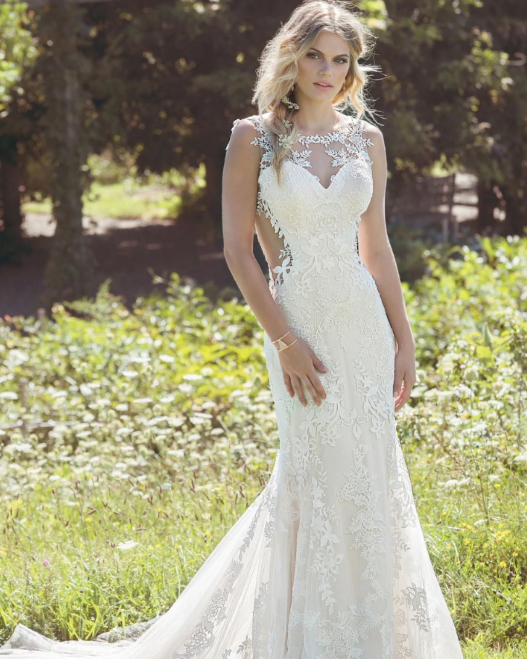 Vestido de novia de Lillian West, de silueta sirena con delicado encaje floral y escote ilusión, creado para una novia romántica que busca un diseño femenino, natural y lleno de movimiento.
