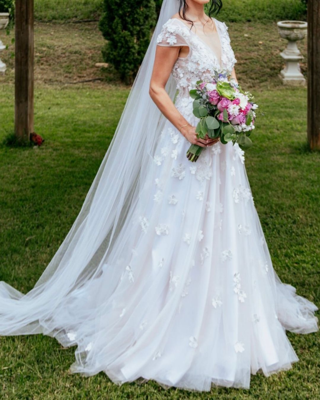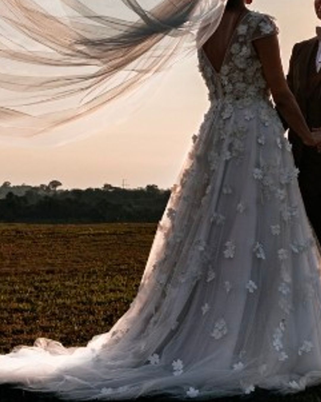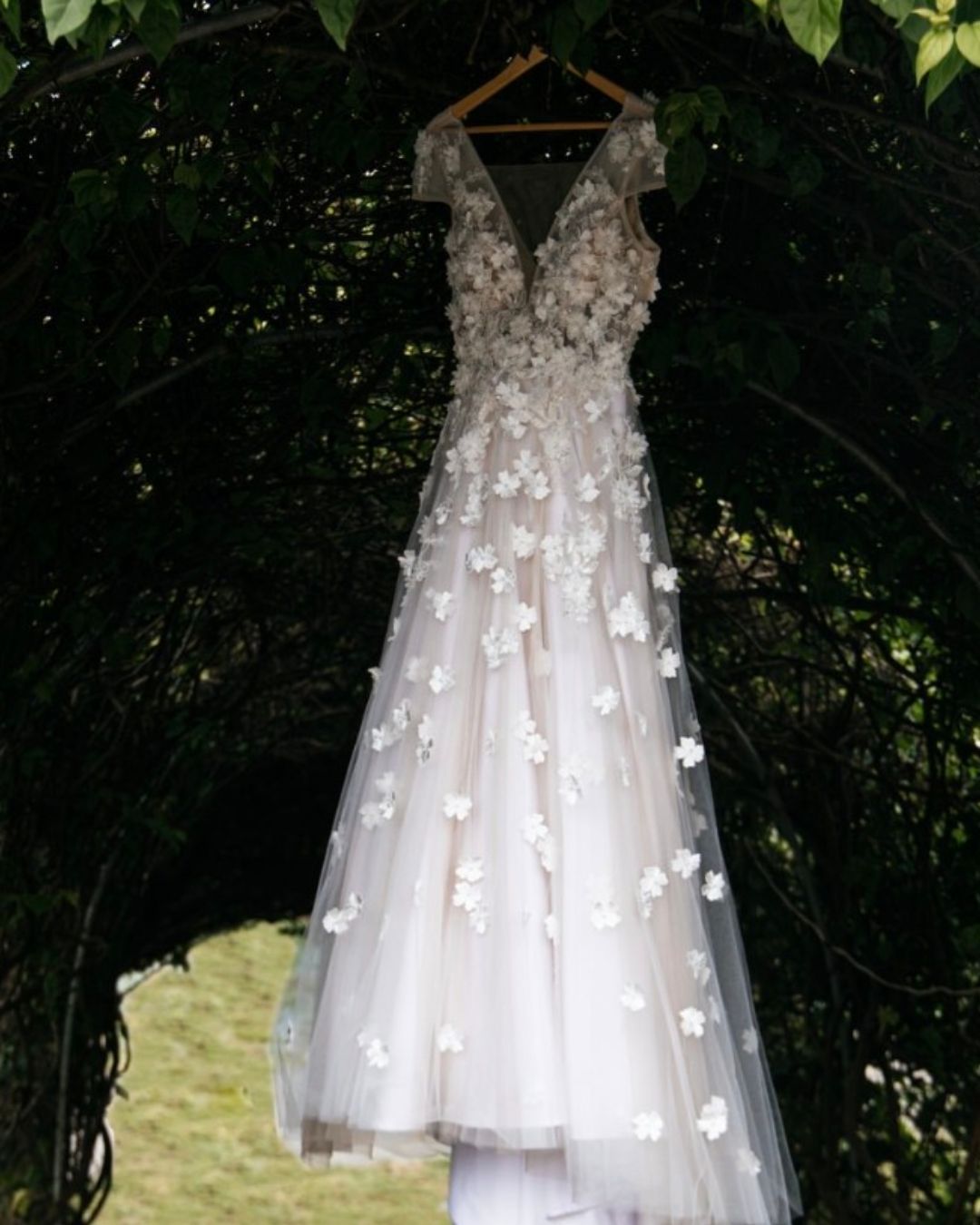 Con un escote en V profundo y tirantes anchos. La falda, confeccionada en capas de tul vaporoso, crea un efecto de ligereza y movimiento, mientras que los apliques florales en 3D distribuidos a lo largo del vestido aportan un aire de ensueño y naturaleza.