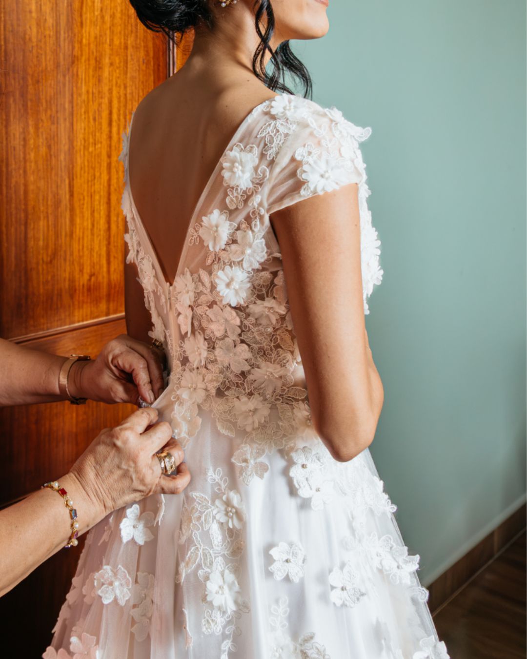 La espalda baja con transparencias y detalles bordados añade un toque sensual y refinado. Es el vestido ideal para una boda al aire libre.