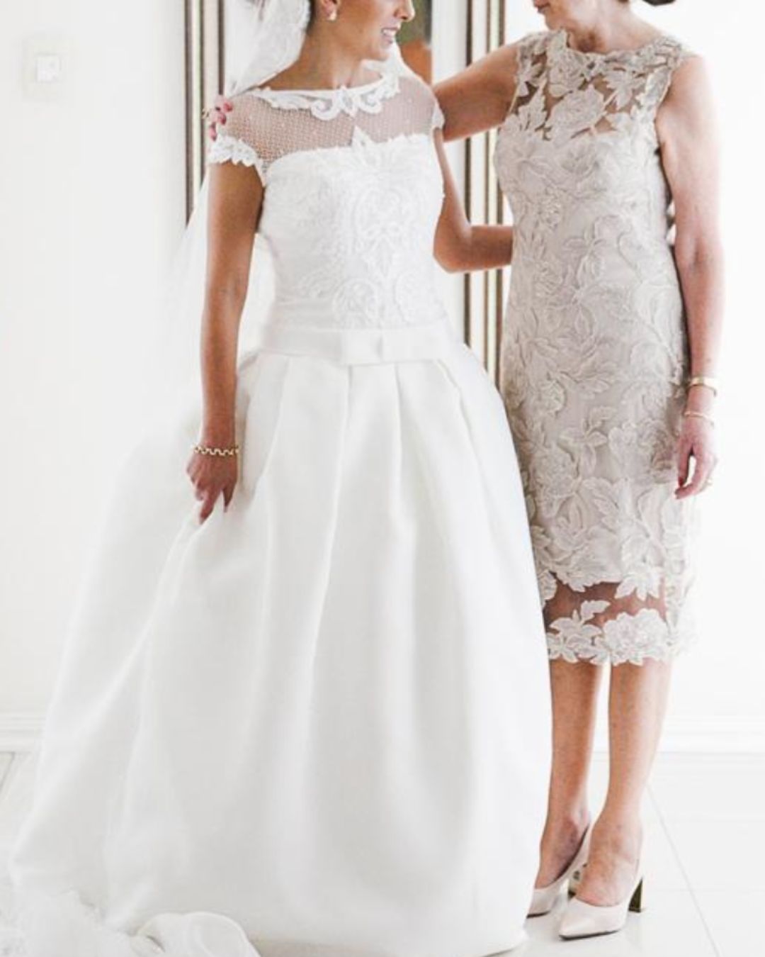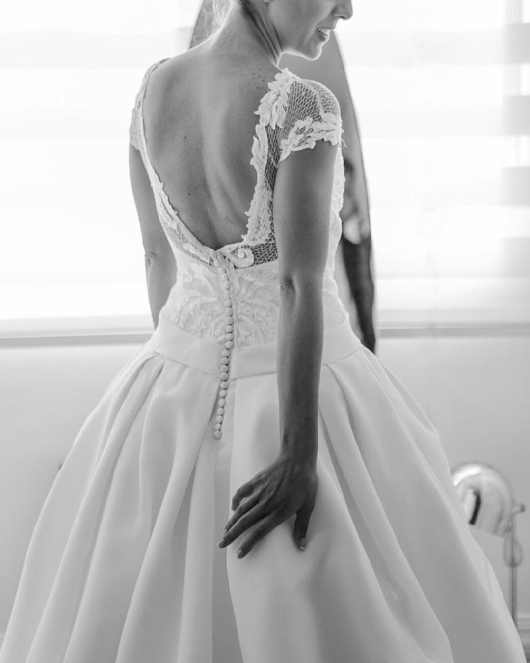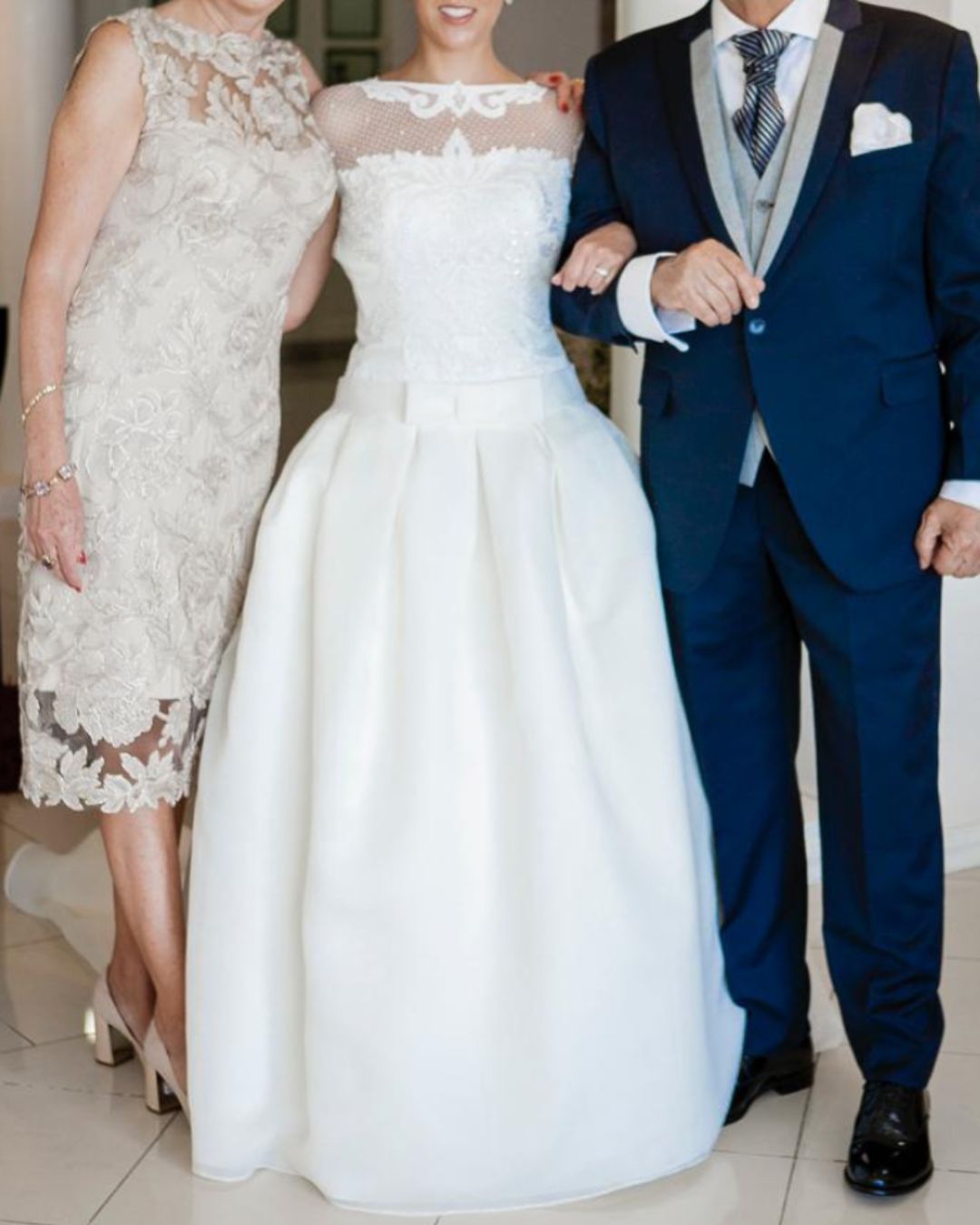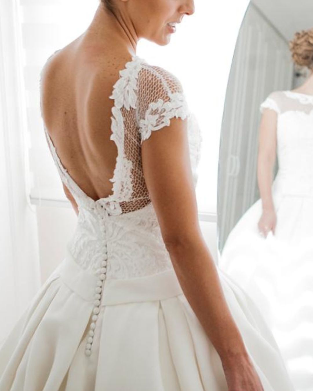 Diseño clásico y atemporal que combina romanticismo y elegancia. El modelo Orga de Aire Barcelona destaca por su cuerpo de encaje bordado con delicadas transparencias en tul ilusión, que crean un escote joya sutil y femenino.