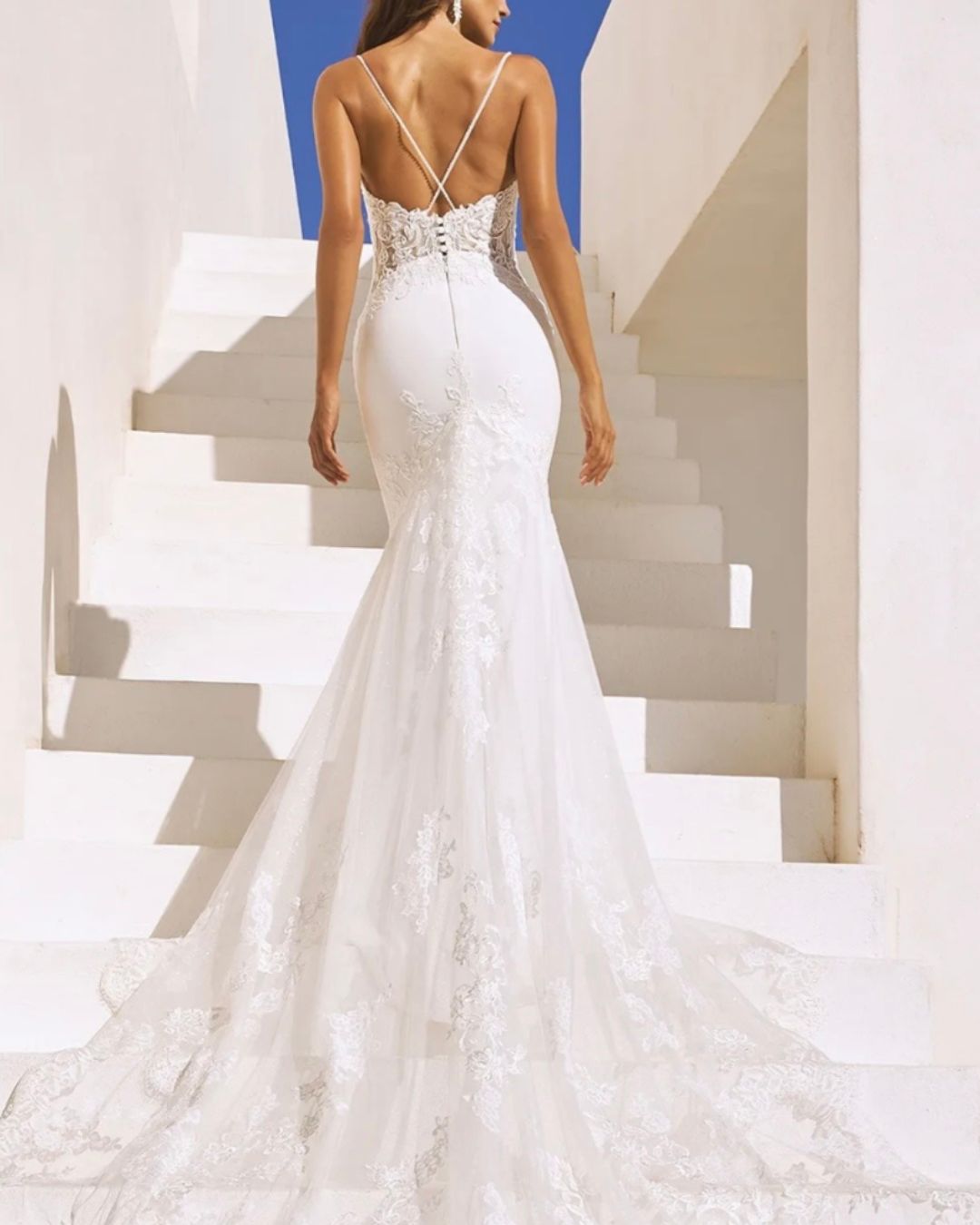 Este diseño de Pronovias es un homenaje a la feminidad moderna. Su silueta sirena abraza la figura con elegancia, mientras que la espalda ilusión con delicados tirantes cruzados añade un toque de sensualidad discreta. El encaje floral bordado se funde con el tul para crear una doble cola impresionante, ligera y etérea, perfecta para caminar hacia el altar con gracia.