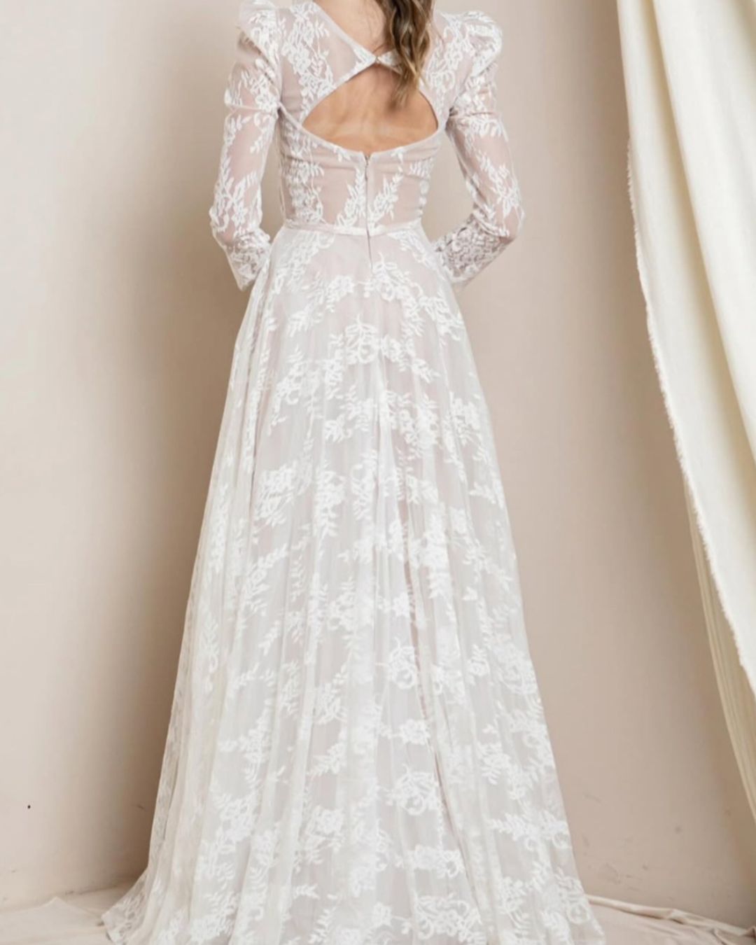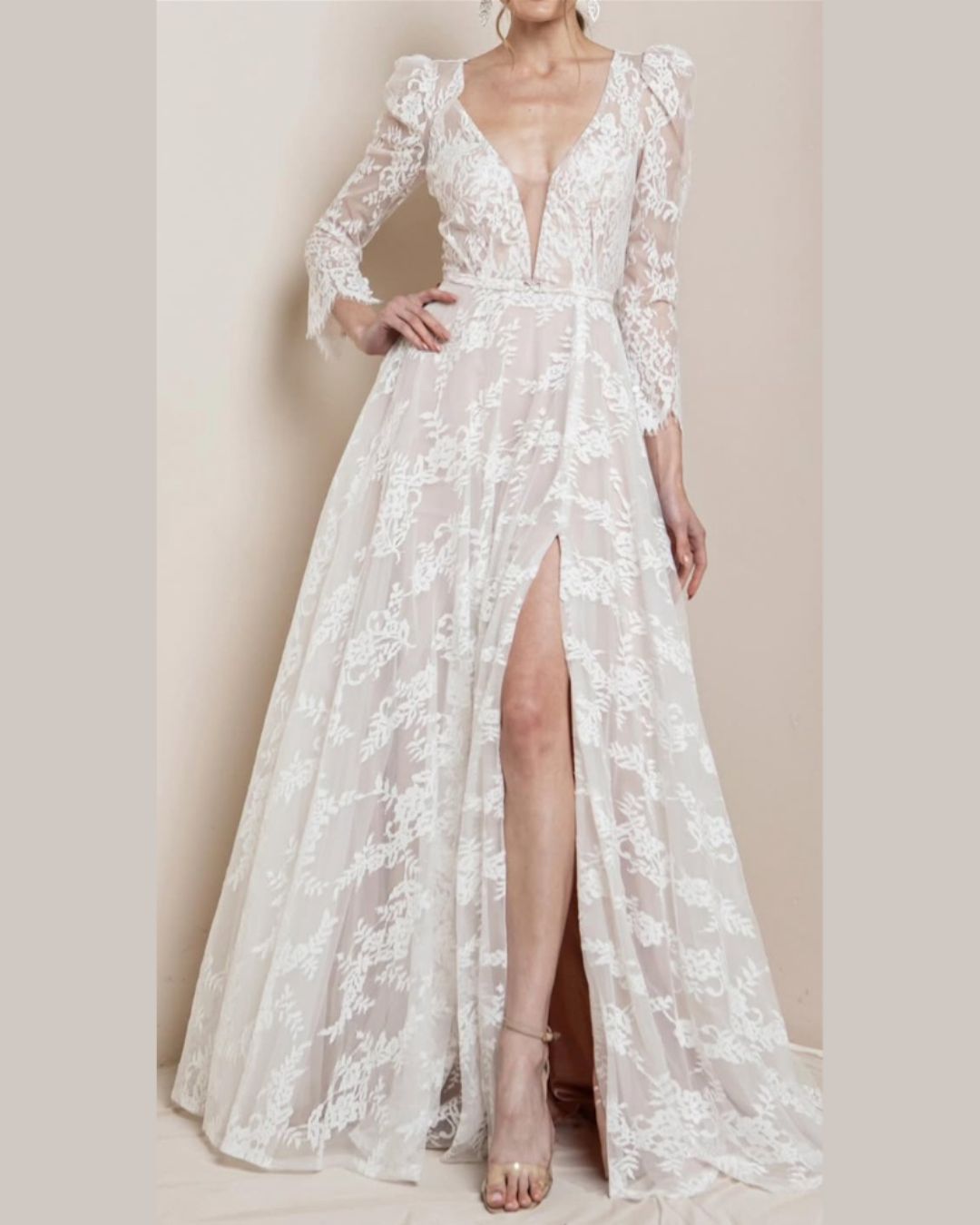 Diseño etéreo y femenino en delicado tul bordado con motivos florales. Su corte en A estiliza la figura, mientras que las mangas largas con volumen y el escote profundo en V aportan un equilibrio perfecto entre romanticismo y modernidad. La abertura frontal le da un toque audaz y elegante. Una creación sofisticada de la firma estadounidense Rosemore Couture.