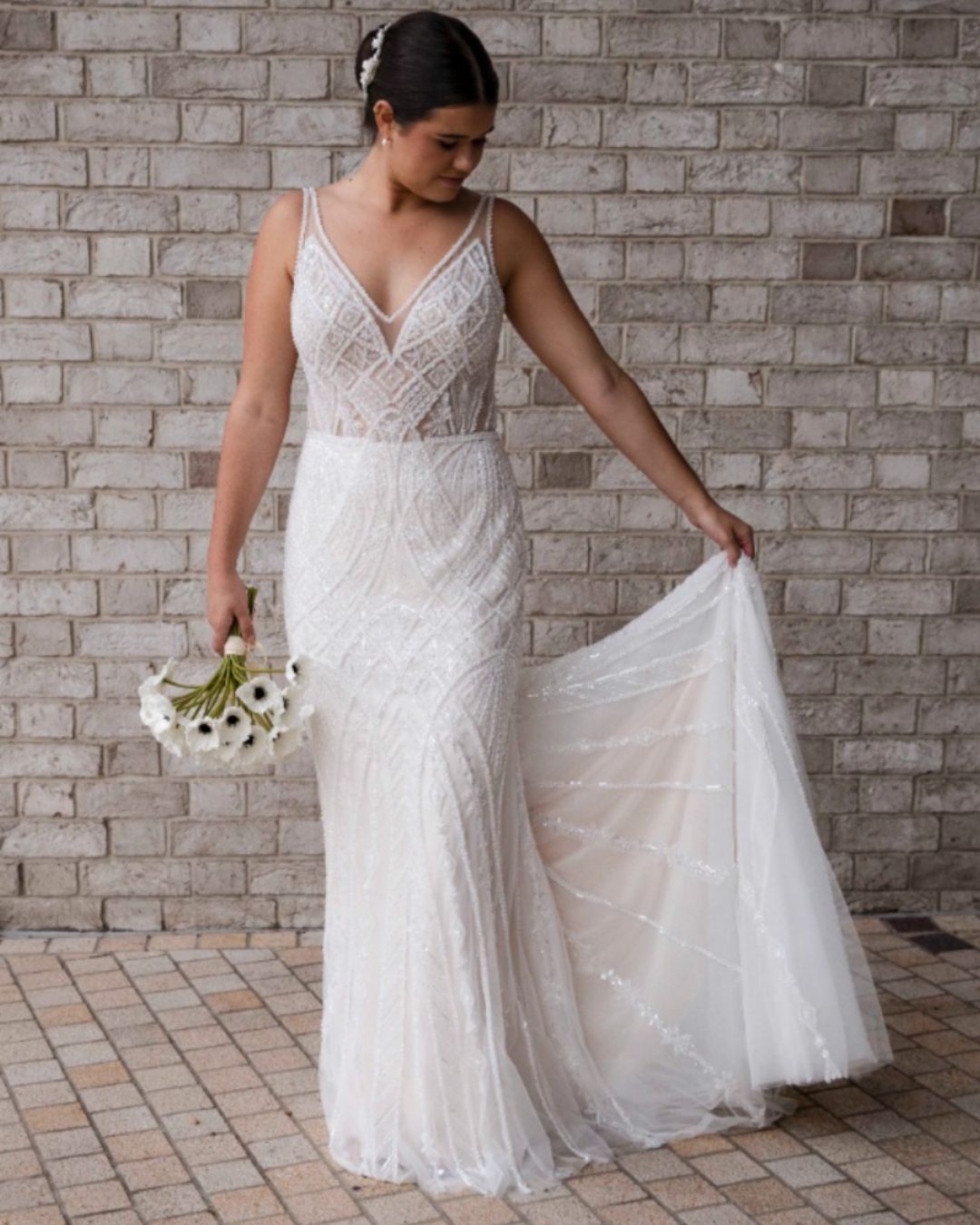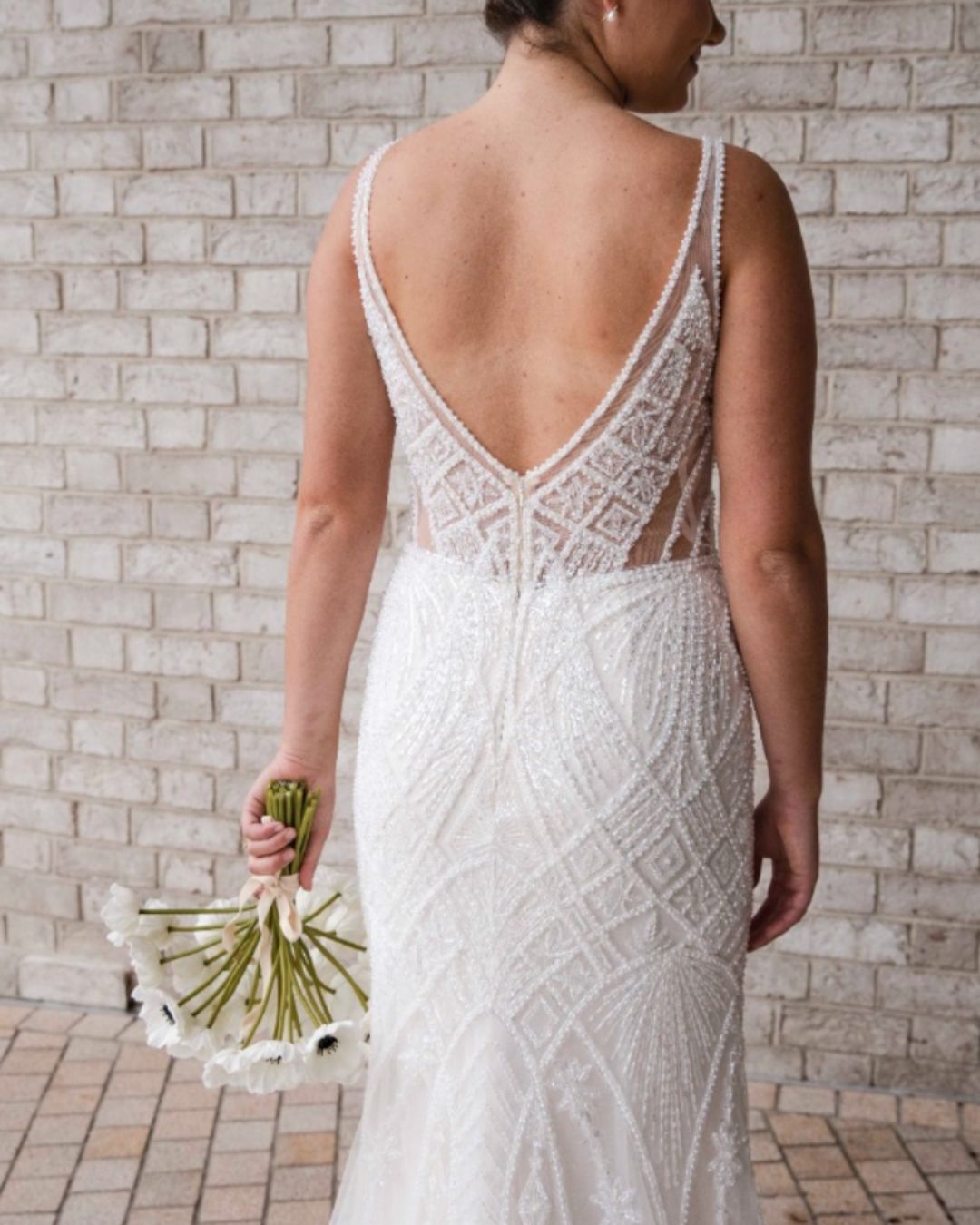 Vestido de la marca australiana RSVP Bridal en corte sirena recto, con delicado bordado geométrico y pedrería que estiliza la figura. Escote en V profundo delantero y trasero con tirantes finos, falda ligera en tul y cola etérea. Perfecto para una novia moderna, elegante y romántica.