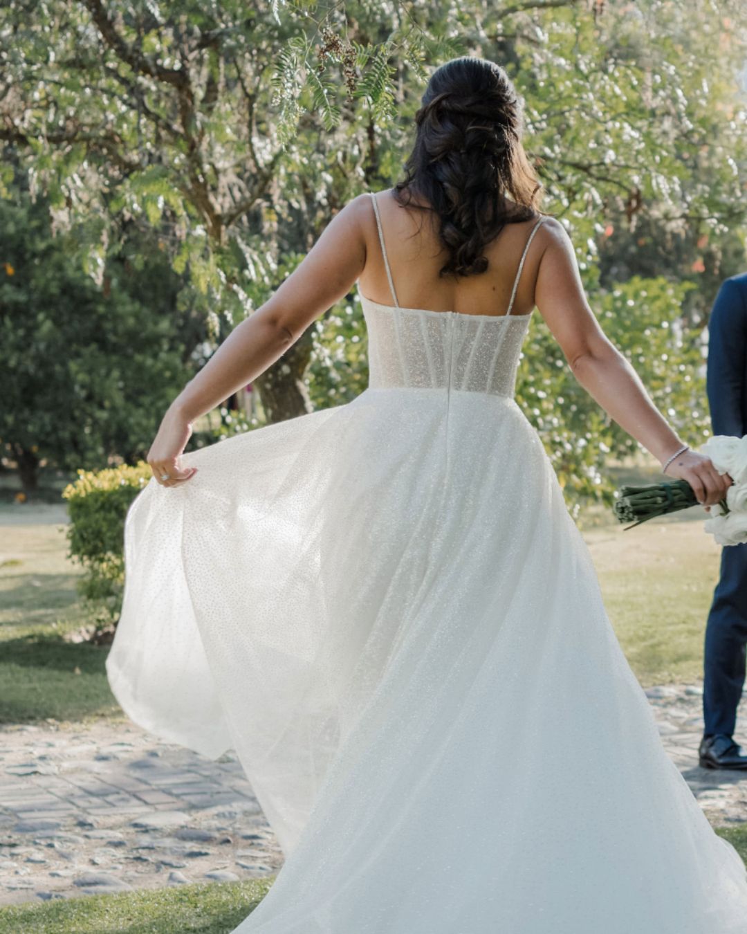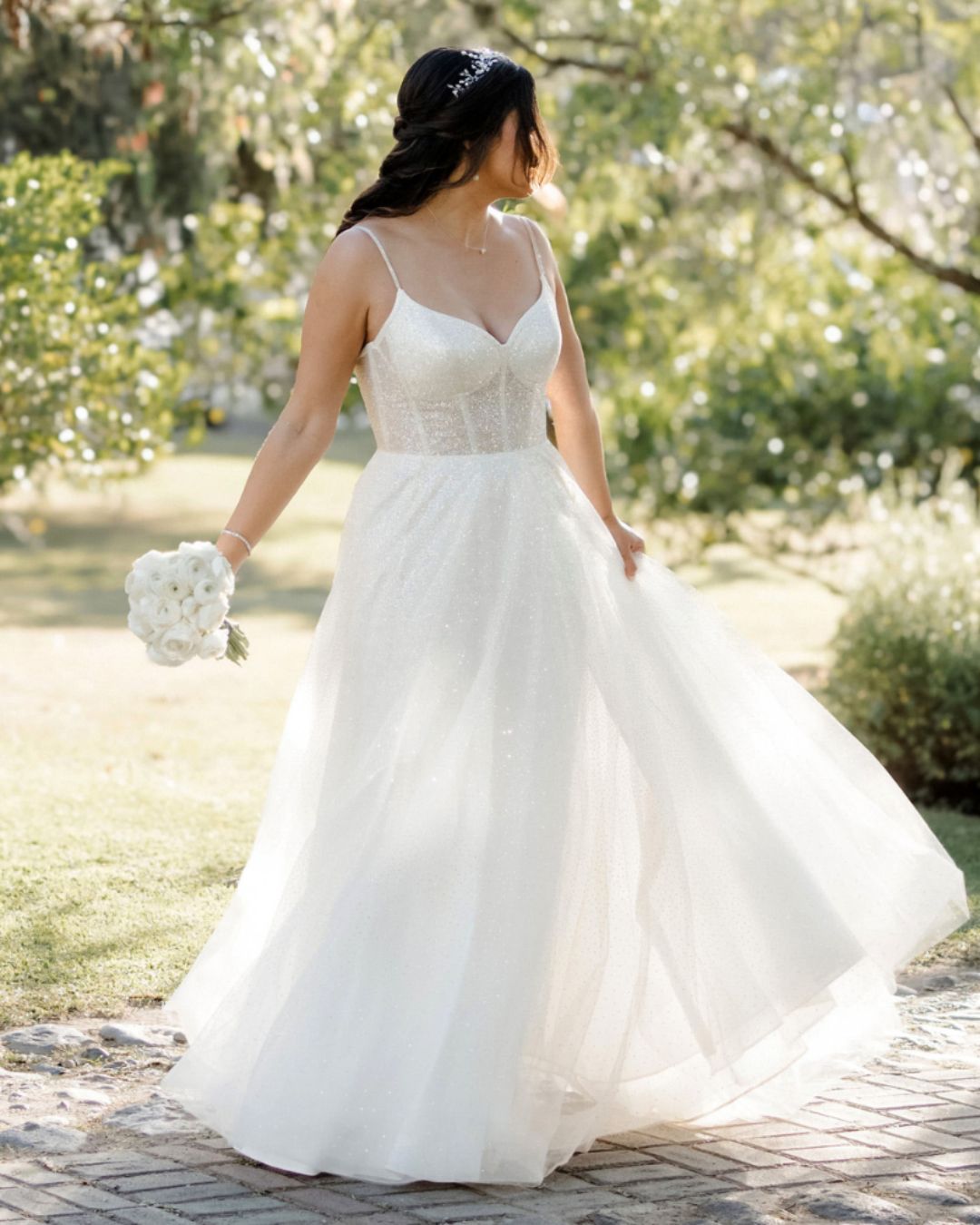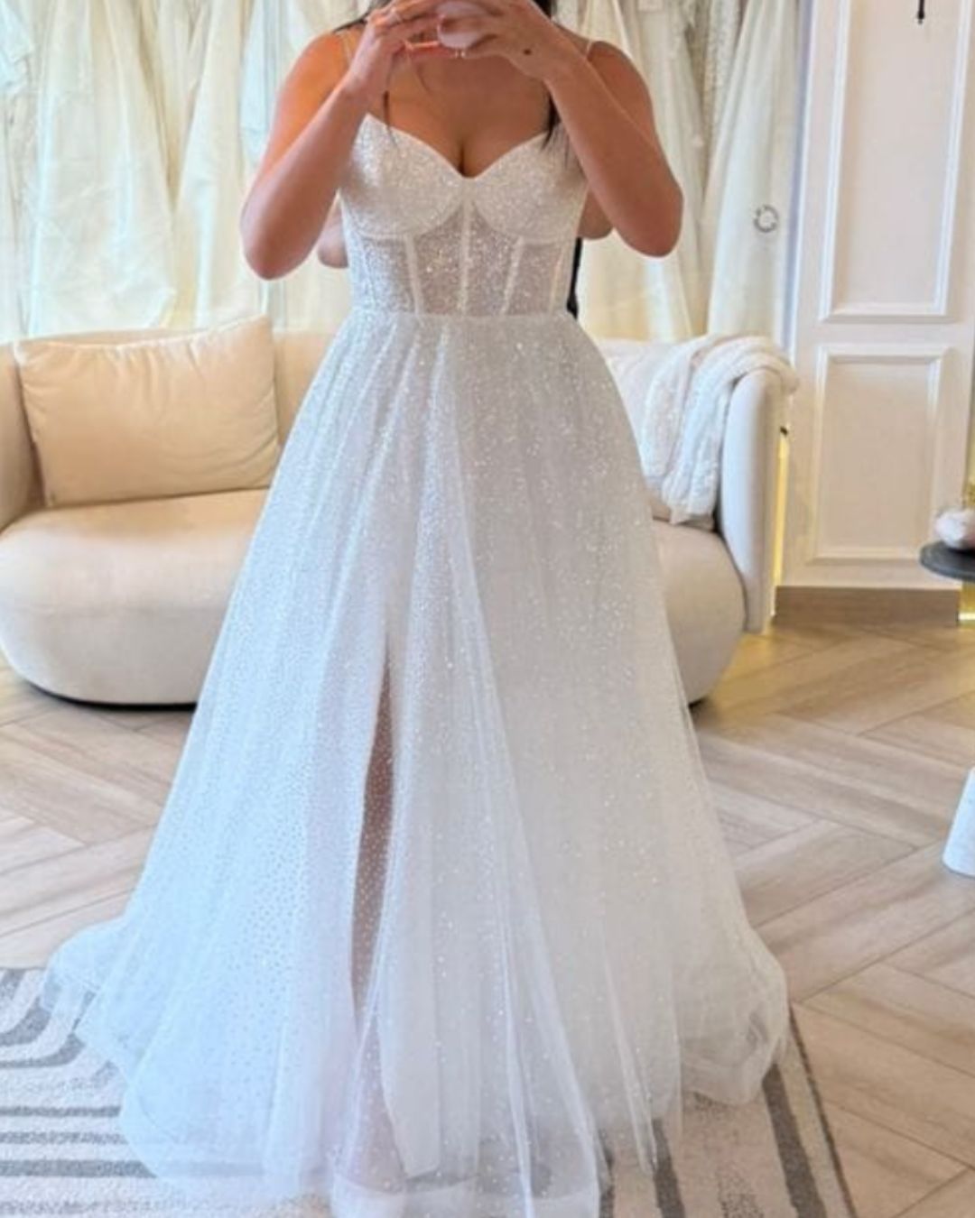 Vestido de novia de tirantes finos con corset transparente y falda de tul brillante en corte A. Un diseño ligero y romántico que combina frescura y elegancia.