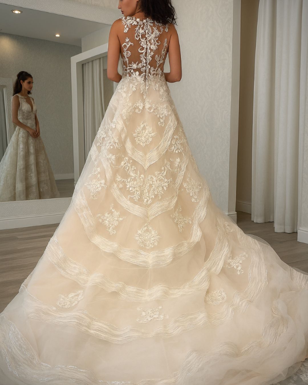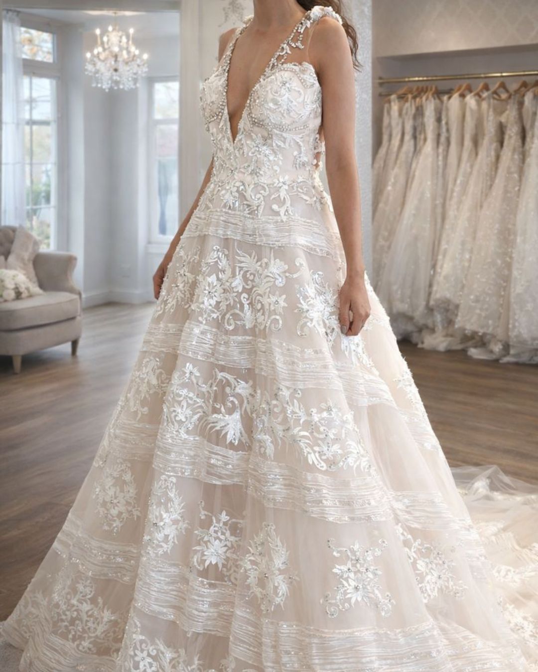 Una obra de arte en tul champagne con bordados florales y pedrería. Su escote profundo en V y tirantes delicadamente decorados aportan un toque sensual y sofisticado. La falda de gran volumen, adornada con encaje y aplicaciones brillantes, crea una silueta de princesa moderna que deslumbra en cada paso. Perfecto para novias que sueñan con un look elegante, impactante y lleno de detalle.