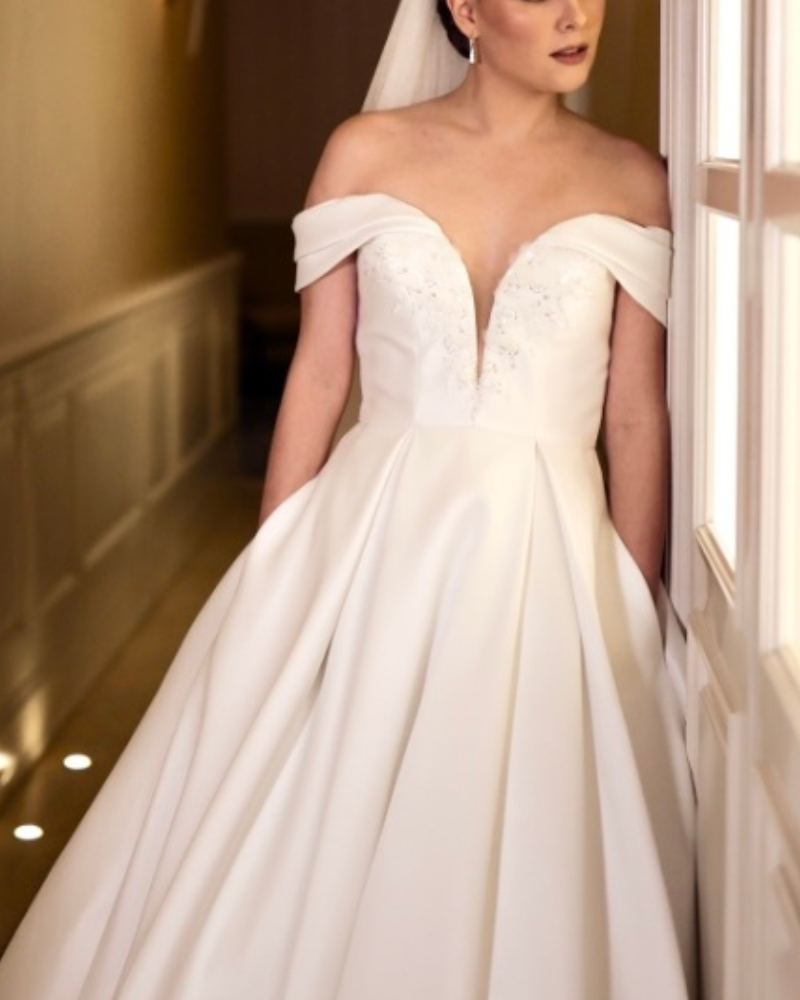 Este vestido de la reconocida casa Pronovias es un homenaje a la elegancia clásica con un giro contemporáneo. Su silueta en A, confeccionada en mikado estructurado, resalta la cintura y aporta una presencia imponente, ideal para ceremonias inolvidables. El escote en forma de corazón con efecto off-shoulder enmarca los hombros con feminidad, mientras que los delicados apliques florales en el busto añaden un sutil toque romántico.