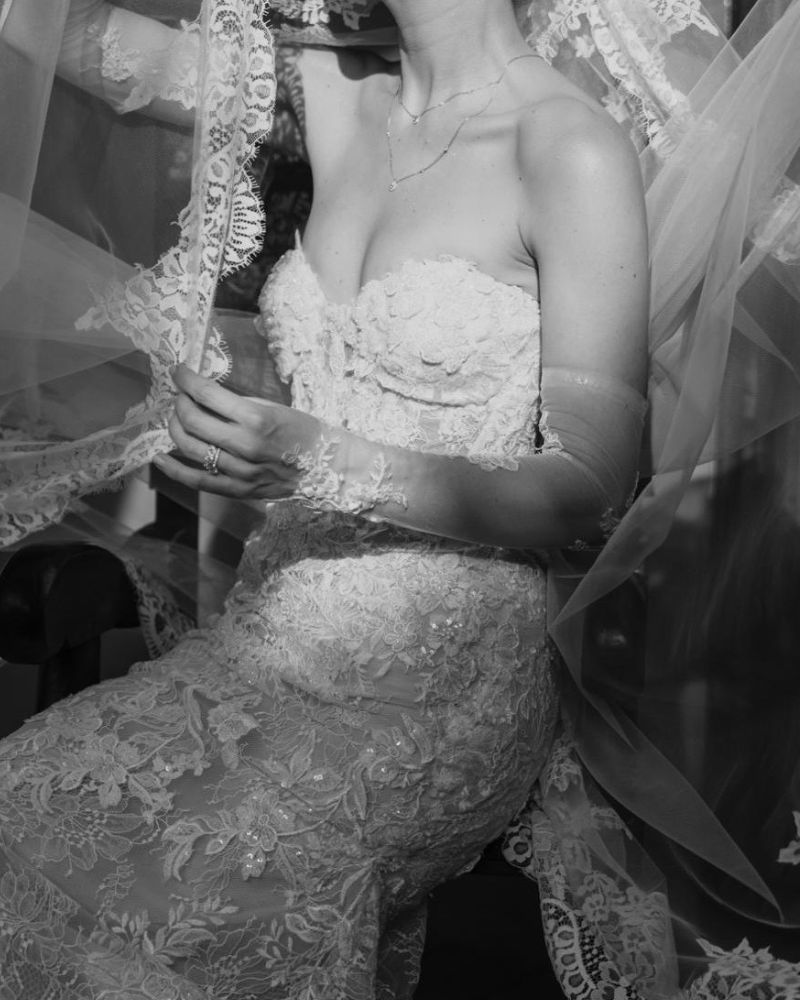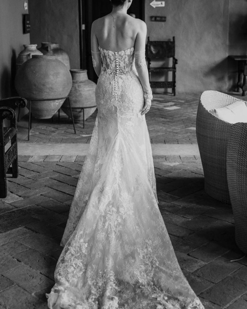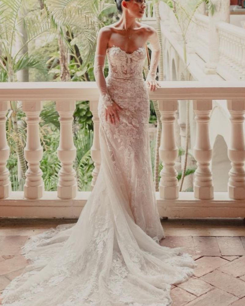 Este espectacular vestido de novia de la firma Pronovias combina sensualidad y sofisticación en un diseño tipo sirena, ideal para realzar la figura femenina. Confeccionado en tul bordado y encaje floral tridimensional, presenta un escote corazón sin tirantes que aporta un aire romántico y moderno a la vez. Su corset estructurado, con transparencias sutiles, estiliza el torso mientras que la falda entallada se abre con delicadeza hacia una cola con encaje festoneado.