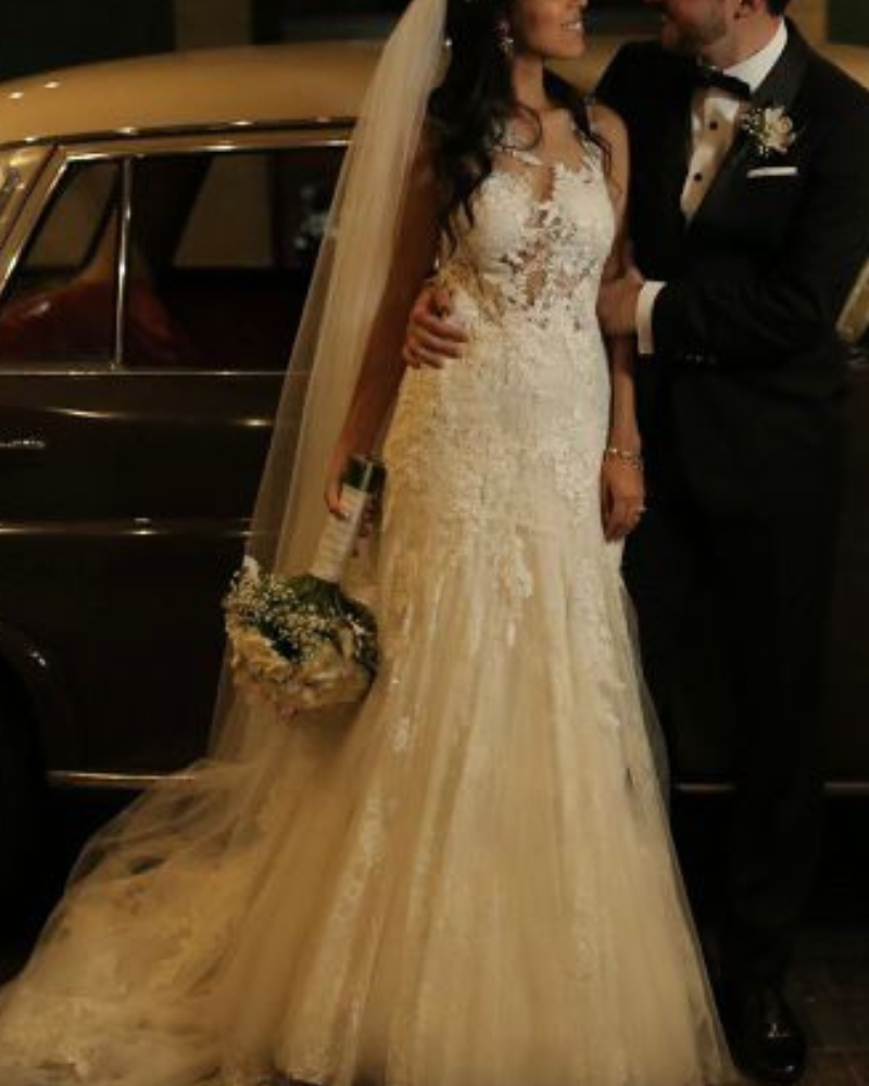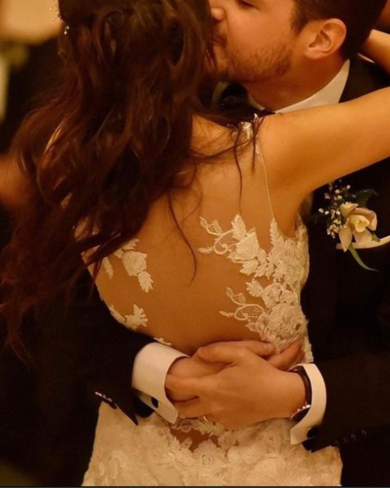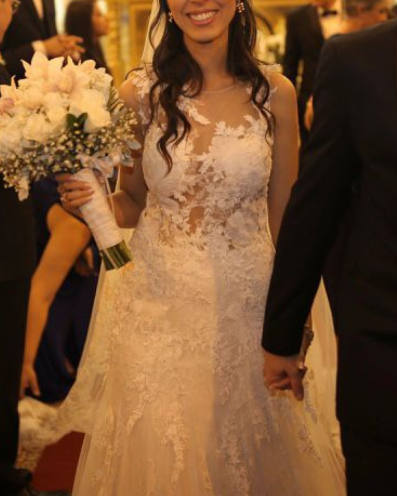 Este diseño de Pronovias destaca por su equilibrio perfecto entre sensualidad y elegancia. La espalda ilusión con detalles florales bordados se funde con la piel, creando un efecto tatuaje sofisticado y moderno. La falda de caída suave, con capas de tul y encaje, aporta movimiento y un aire etéreo que cautiva desde cualquier ángulo.