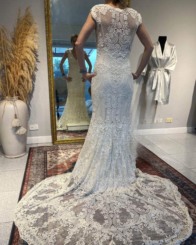 El vestido está compuesto por dos piezas. La parte superior es como un cuerpo de encaje tipo crochet, de estilo delicado y muy detallado, con un diseño que se ajusta suavemente al torso y crea un efecto transparente sofisticado en la espalda y los hombros.