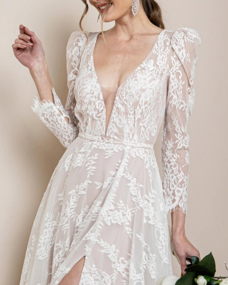 Diseño etéreo y femenino en delicado tul bordado con motivos florales. Su corte en A estiliza la figura, mientras que las mangas largas con volumen y el escote profundo en V aportan un equilibrio perfecto entre romanticismo y modernidad. La abertura frontal le da un toque audaz y elegante. Una creación sofisticada de la firma estadounidense Rosemore Couture.
