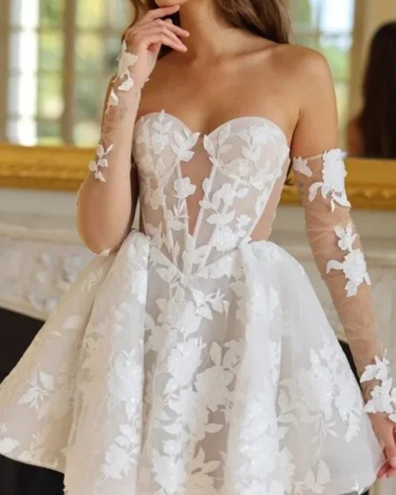 Un diseño moderno y romántico, perfecto como second dress o para un civil. Confeccionado en tul con apliques florales bordados, cuerpo corset con escote corazón y mangas desmontables, que resaltan frescura y feminidad. Rosie Etienne, reconocida por su estilo sofisticado y actual, transforma este look en una opción audaz y memorable.