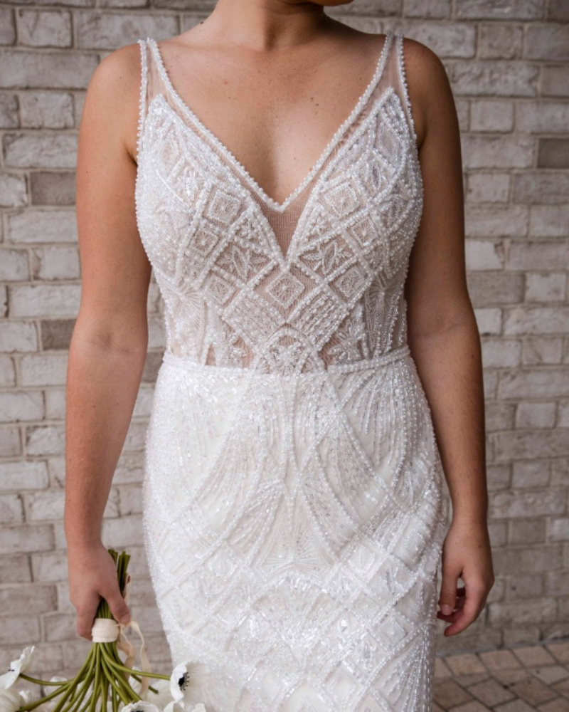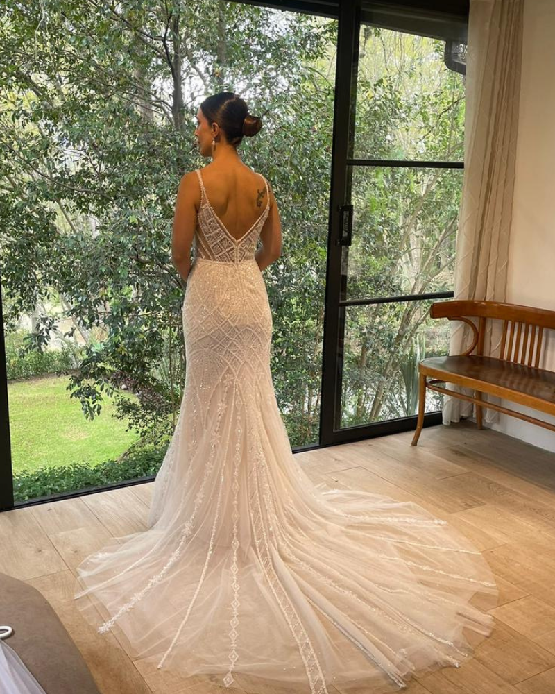 Vestido de la marca australiana RSVP Bridal en corte sirena recto, con delicado bordado geométrico y pedrería que estiliza la figura. Escote en V profundo delantero y trasero con tirantes finos, falda ligera en tul y cola etérea. Perfecto para una novia moderna, elegante y romántica.