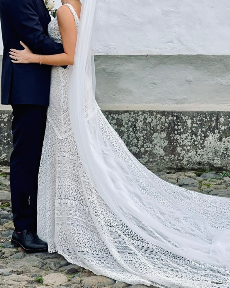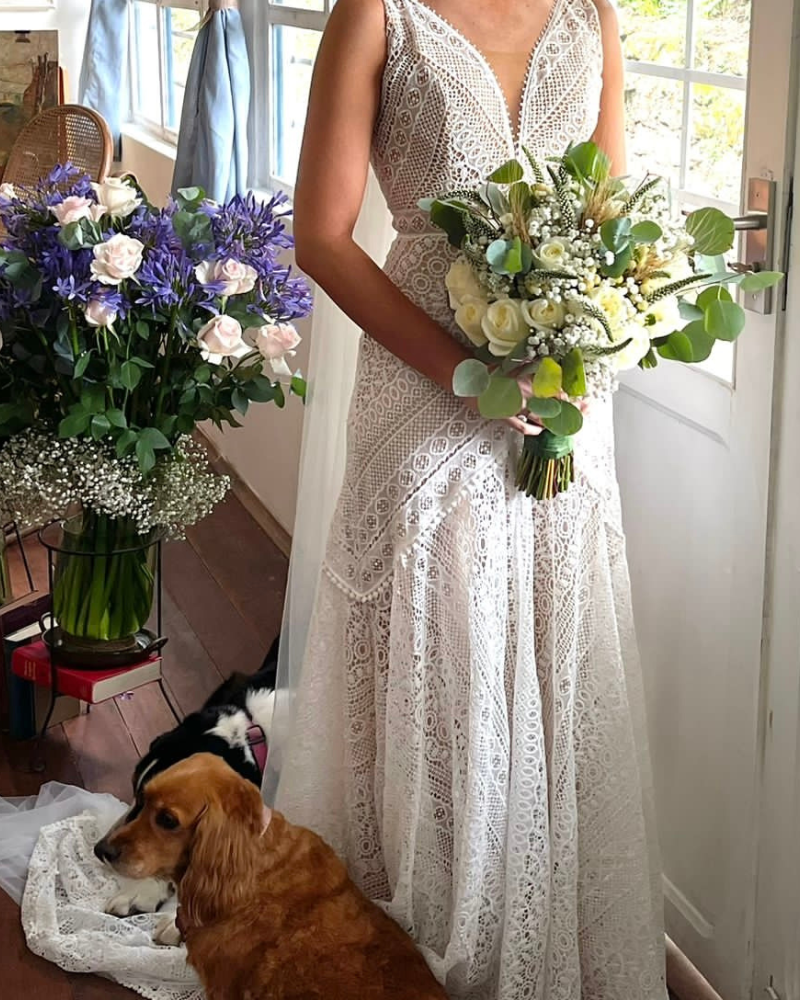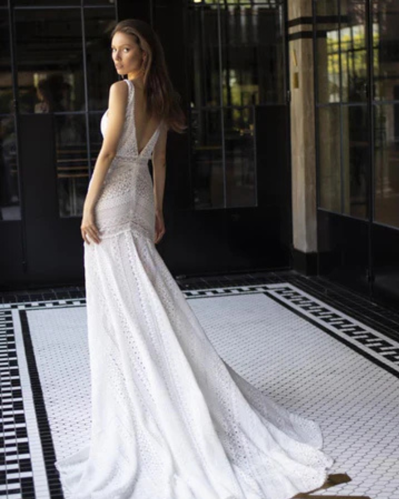 Este diseño de Yoav Rish combina a la perfección lo bohemio con lo sofisticado. Con un encaje geométrico único y un escote profundo en V que alarga la silueta, este vestido está pensado para novias modernas que buscan destacar con estilo y personalidad. La caída suave y liviana lo hace ideal para bodas al aire libre o destinos cálidos, mientras que su confección estructurada garantiza una figura estilizada. Un vestido que habla de libertad, diseño y autenticidad.